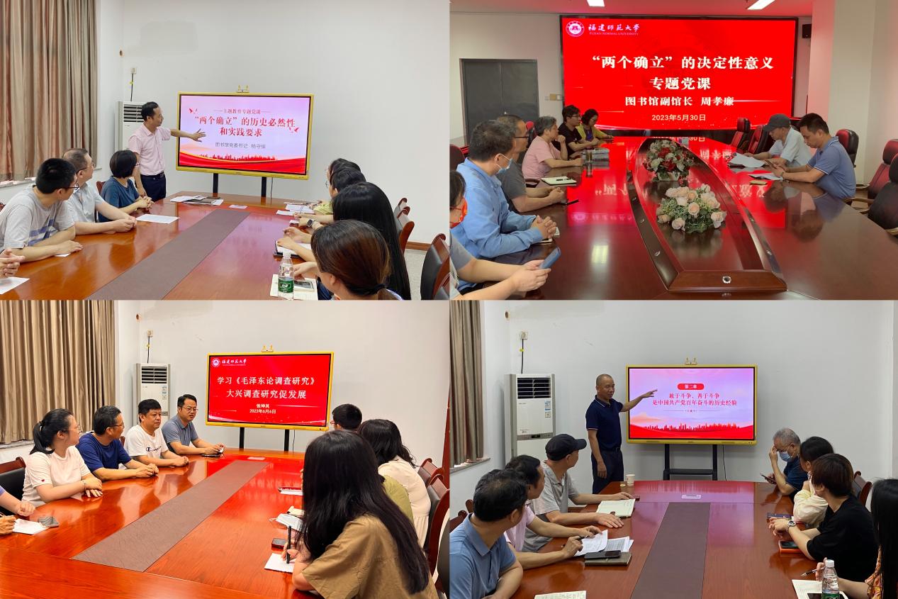 按照主题教育工作安排,5月30日至6月21日,图书馆领导班子成员陆续为党员干部讲授主题教育专题党课。党委书记杨守辉为第三党支部党员上了题为《“两个确立”的历史必然性和实践要求》的专题党课,副馆长周孝廉为第一党支部党员上了题为《“两个确立”的决定性意义》的专题党课,副馆长李延贵为中心组成员和第四党支部党员上了题为《认真学习习近平总书记关于敢于斗争、善于斗争重要论述精神》的专题党课,六级职员张坤其为第二党支部党员上了题为《学习<毛泽东论调查研究>,大兴调查研究促发展》的专题党课。