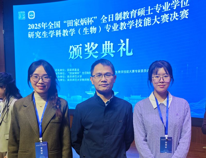 此前的11月22日,全国“田家炳杯”全日制教育硕士学科教学(生物)专业研究生教学技能大赛决赛在南京师范大学落幕。该赛事为教育硕士教学技能领域重要赛事,吸引59所高校164名晋级选手参赛,以抽题备课、模拟授课、现场答辩等环节考评综合能力。依托成熟培养体系,学院精准选拔并全程护航,2024级学科教学(生物)专业硕士生黄婧获全国一等奖,陈雨楠获全国三等奖,指导教师陈烟兰获评“优秀指导教师”。