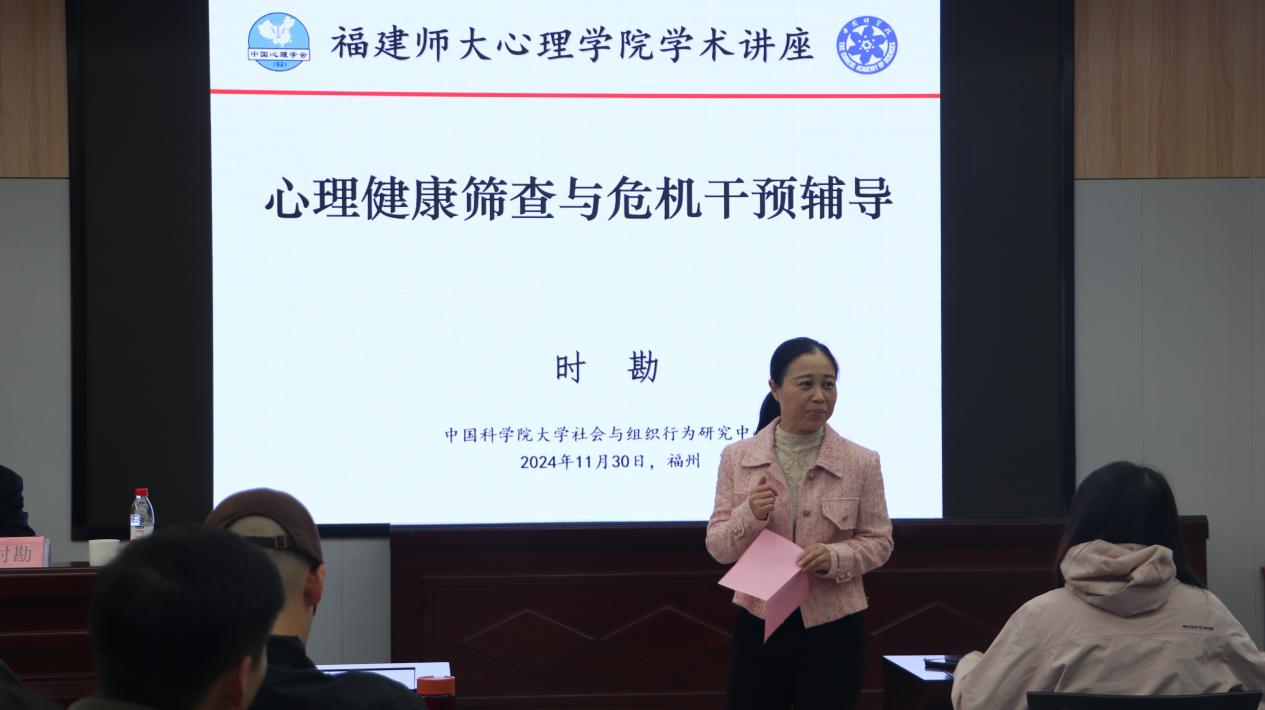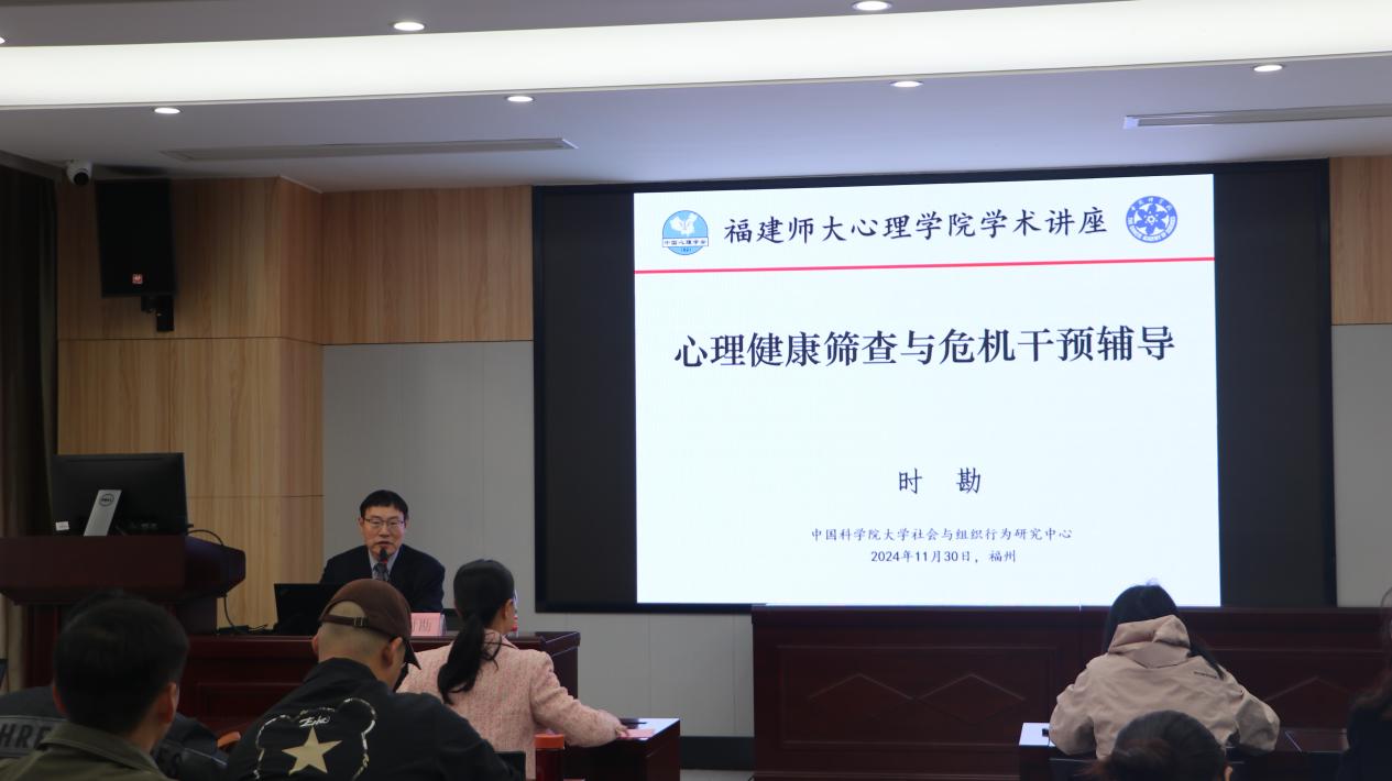 11月30日上午,温州大学温州模式发展研究院院长,中国科学院大学社会与组织行为研究中心主任、浙江省“生态文明与环境治理”文科实验室首席科学家,中国心理学会首任监事长时勘教授,在我院人文楼1-102开展“心理健康筛查和危机干预”的主题讲座。讲座由院长孟迎芳教授主持。