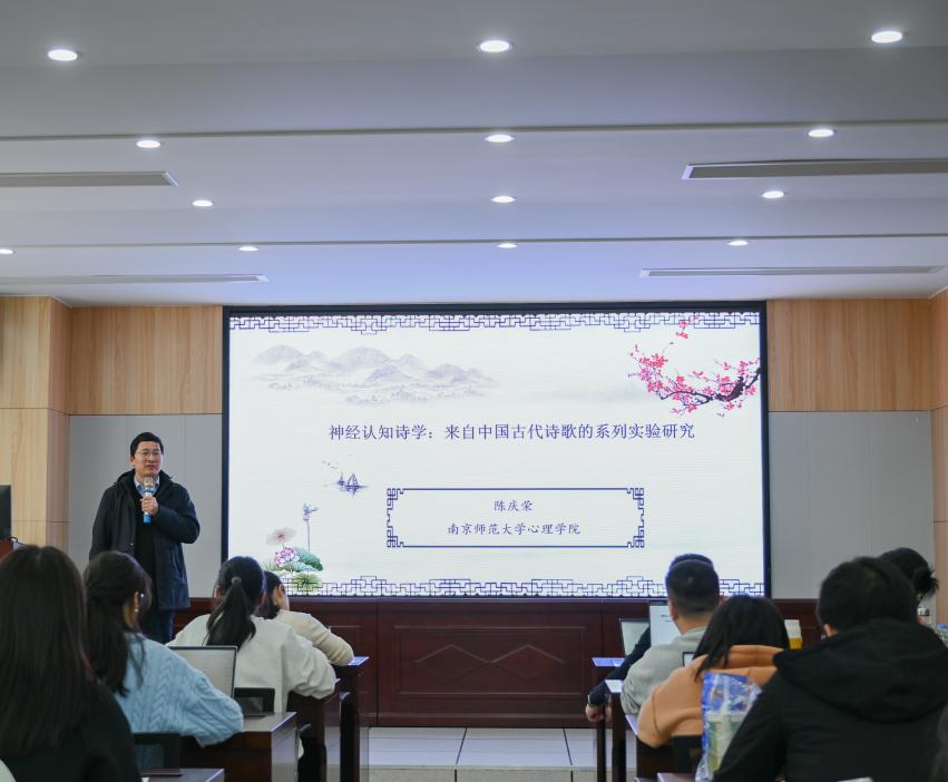 4月1日,南京师范大学心理学院院长、博士生导师陈庆荣教授应邀为我院师生开设主题为“神经认知诗学:来自中国古代诗歌的系列实验研究”的学术讲座。本次讲座由孟迎芳副院长主持,我院部分教师、研究生和本科生参与。