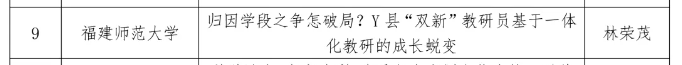 日前,福建省学位委员会办公室印发《关于公布第三批研究生教育项目名单的通知》。经高校申报、专家评审,省学位委员会办公室认定第三批福建省产教融合研究生联合培养基地30个、研究生教育精品课程31门、专业学位研究生优秀教学案例30个。我院林荣茂教授的“归因学段之争怎破局?Y县‘双新’教研员基于一体化教研的成长蜕变”获批专业学位研究生优秀教学案例;许艳凤副教授的“学校团体心理辅导技术与应用”获批研究生教育精品课程。