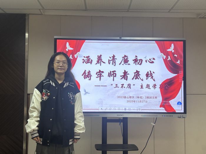 为深入学习贯彻全面从严治党要求,引导师范专业青年学子厚植清廉底色、筑牢职业底线,11月27日,我院2023级心理学(师范)二班团支部在人文楼527教室成功举办“涵养清廉初心,铸牢师者底线”“三不腐”主题学习会。