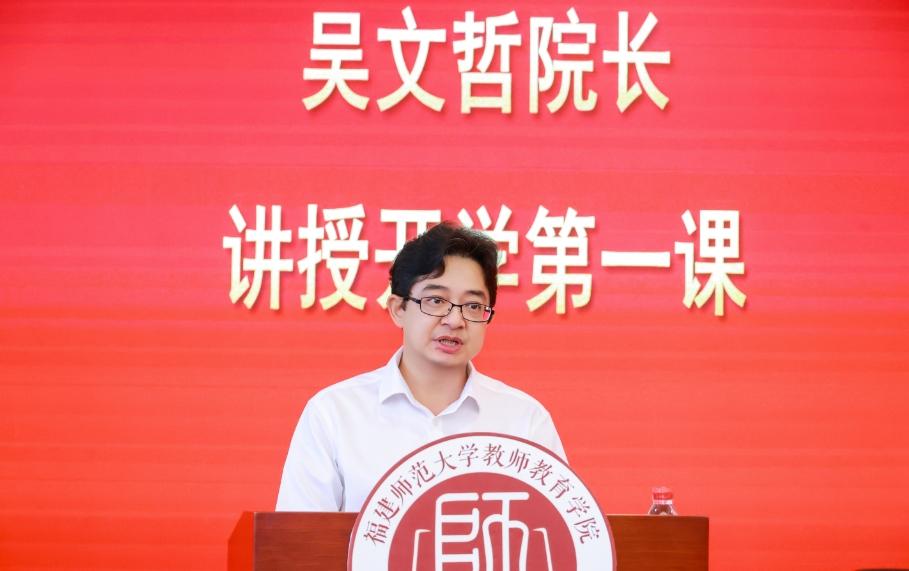 院长吴文哲代表学院热烈欢迎2024级全体新同学加入教师教育学院“大家庭”,向出席典礼的全体教师和师范生送上教师节的祝福,并围绕“大力弘扬教育家精神,加快建设教育强国”为2024级新生带来“开学第一课”。他对新生提出三点希望:一要行为世范,铸师德之“魂”。希望同学们自觉用“教育家精神”激励自己,以“四有好老师”的标准严格要求自己,做到以德立身、以德立学。二要勤学笃行,强能力之“基”。希望同学们珍惜在校时光,充分利用校院提供的良好条件,博观约取、厚积薄发,脚踏实地、持之以恒地夯实能力基础。三要求实创新,展进取之“翼”。希望同学们始终处于学习状态,努力站在知识发展前沿,刻苦钻研、严谨笃学,练就善于研究、敢于创新的过硬本领。同时,基于“五育并举”的理念,他为同学们提供了有关上课、阅读、艺术欣赏、体育锻炼、心理调节、健康生活等方面的十条具体建议,鼓励同学们从日复一日的小事做起,不断充实、拓展、提高自己,早日成为全面发展、堪当民族复兴重任的时代新人。