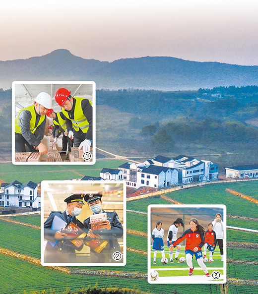 图①:学员在新疆维吾尔自治区温宿县技工学校学习砌筑工专业技能。 艾则孜·沙木沙克摄(人民视觉) 图②:在江苏省盐城市亭湖区,执法人员对冷冻生鲜类食品进行检查。 张凯峰摄(人民视觉) 图③:四川省凉山彝族自治州昭觉县瓦吾小学的女足队员们在球场上训练。新华社记者 沈伯韩摄 底图:浙江省安吉县天子湖镇高庄村晨景。潘学康摄(人民视觉)