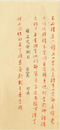 相较于蓝理,蓝廷珍奏折档案有不少得以保留下来,从中可以看出其不仅军功卓越,在官场上的表现也变得游刃有余。现存官方文档中,蓝廷珍的首份奏折是在清雍正元年(1723年),上奏称其姓名的字音与雍正名讳(爱新觉罗·胤禛)相同,恳请改名。雍正对此不以为意,朱批:“不必从来只讳上一字,近来将下一字都要讳,觉太烦。”“况珍字于御讳总不相干,若书满字他们都写贞字,这还犹可,汉字何必改,你的名字朕甚喜欢,就是原字好。”故而未更改。
