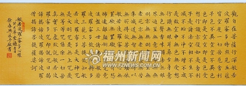 尤其难得的是,徐春兴大字气势磅礴、巍峨逼人;楷书小字却行云流水、生机盎然。如其书写的小楷《心经》,结体宽博严谨,下笔科学到位,笔划横细竖粗,精到绝伦,特别是横画与竖画的起笔处自然带出成小樱桃状,即有唐代《灵飞经》的动感,又有王羲之《十三行》清秀刚劲的风格,通篇则有凛然不可犯的气势,尽显唐代民间写经的经典风范,别具一格,难得多见。