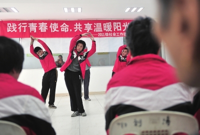 这些学员都是福利家园的智障人士,在他们的身旁,是来自星空下载游戏推荐安卓社历院11级社会工作班的学生们,他们正在参加“共享温暖阳光”为主题的联欢会。