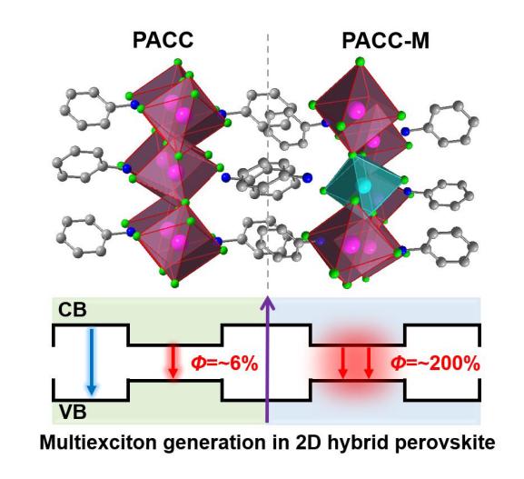 二维(2D)有机无机杂化钙钛矿由于具有带隙可调、发光稳定性好和可溶液加工等优点,在发光二极管、信息防伪、安全加密、激光器和X射线探测等领域显示出巨大的应用潜力。但无机金属离子之间强相互作用引起的激子热猝灭和自吸收导致2D钙钛矿的发光效率普遍较低。该论文通过向Cd基钙钛矿(PACC)中引入客体金属离子Mn2+,将PACC的量子产率从6%提高至~200%。实验数据证明,Mn2+的掺杂不仅可以诱导钙钛矿的多激子生成(MEG)过程,避免无机激子的能量损失,而且还可以促进有机三态激子能量向无机激子的转移,从而实现Cd2+的超高效红光发射。