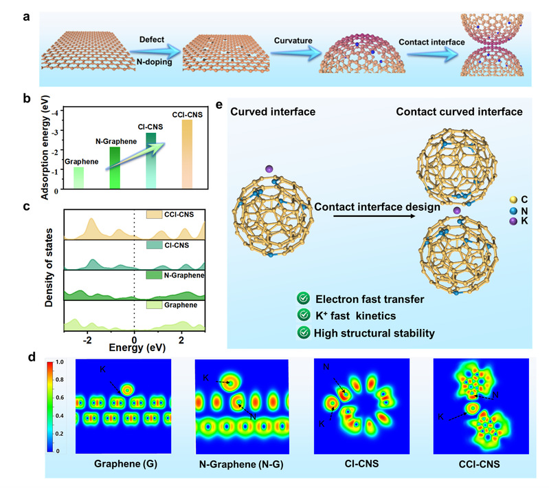 据悉,作为一种新兴的二次碱金属离子电池,钾离子电池(PIBs)因其资源储备丰富而受到广泛关注。发展新型高容量碳材料是实现PIBs应用的重要环节。目前,主要通过设计新型纳米结构来提高碳材料的储钾性能。然而,碳材料的接触曲率界面(CCI)对其电子结构和储钾性能的影响鲜有研究。该研究发现CCI能显著提高碳材料费米能级处的电子密度,其高电子活性CCI位点促进了钾离子的吸附,进而提升储钾容量和倍率性能。研究成果有助于深入理解CCI诱导电子结构的变化和碱金属离子的储存,也为开发新型储能材料提供研究思路。