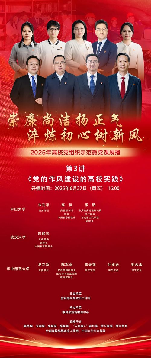 崇廉尚洁扬正气,淬炼初心树新风。6月27日(星期五)16:00,跟随中山大学、武汉大学、华中师范大学师生党员,走进2025年高校党组织示范微党课第3讲《党的作风建设的高校实践》。关注微言教育微信,通过微言教育视频号、微博等平台收看直播——